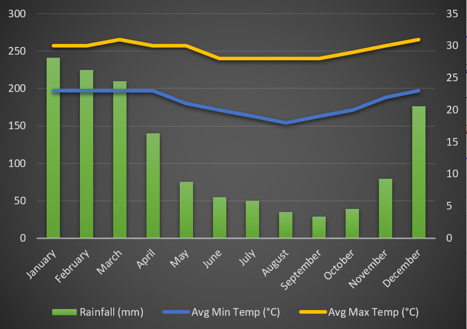 Comoros’ location 12 degrees south of the equator gives it a warm tropical climate, making it possible to visit year round. It has a maritime tropical climate with two main seasons: the wetter, warmer season, from December to April, and the drier, cooler season from May to November. Daytime temperatures average about 31°C in the summer months and 27°C in the cool season, with overnight temperatures about 8° less. The cooler season is the most popular time to visit, but no matter when you come you will always find warm weather and smiling faces in Comoros.